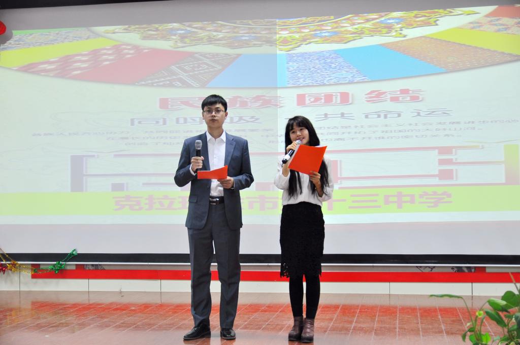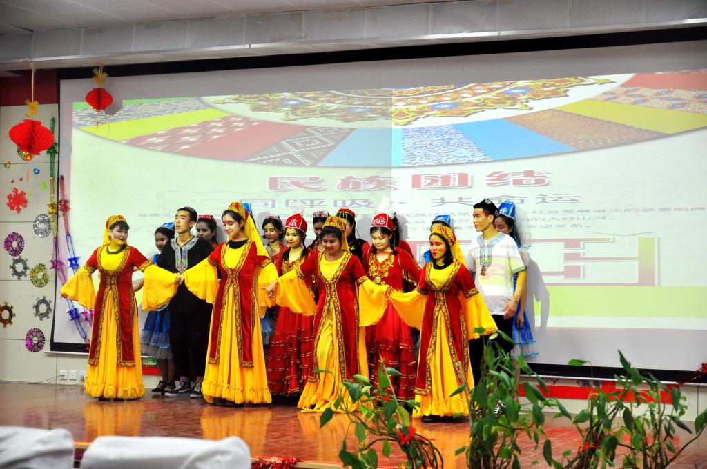 在高一年级欢快的维吾尔乐曲、优美的舞姿中,老师、同学跟着节奏和唱,把整场联欢活动推向高潮。校党总支书记邢锐带领教服部教师和结亲学生为我们深情诵读“民族团结一家亲”。